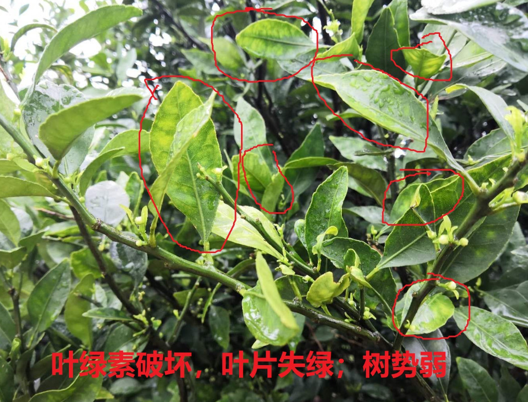 2、2017年收果前使用兩次甜蜜素的果樹--葉片黃、樹勢弱、花芽少、春梢少。【2018年3月20日觀察】