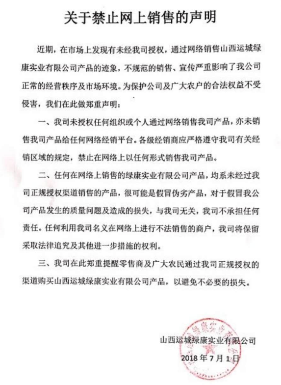 近期,我山西運城綠康工作人員在市場上發現有未經我公司授權,在網絡上銷售我司產品的跡象,為保護及廣大客戶的合法權益不受侵害,我公司特作一下聲明文件,詳見具體文件: